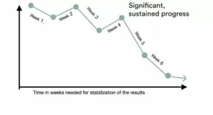 Чем ниже кривая, тем меньше степень накала симптомов. Как мы видим пациент приходит с довольно высоким уровнем накала симптоматики и, как правило, во время первой недели начинает испытывать облегчение. Это — 80% наших пациентов. 10% испытывают ухудшение в симптоматике (обострение) во время первой недели (даже после первых двух сеансов) и остальные 10% не испытывают обострения вообще. Во время второй недели наш пациент начинает жаловаться на ухудшение общего состояния и возврата некоторых симптомов.